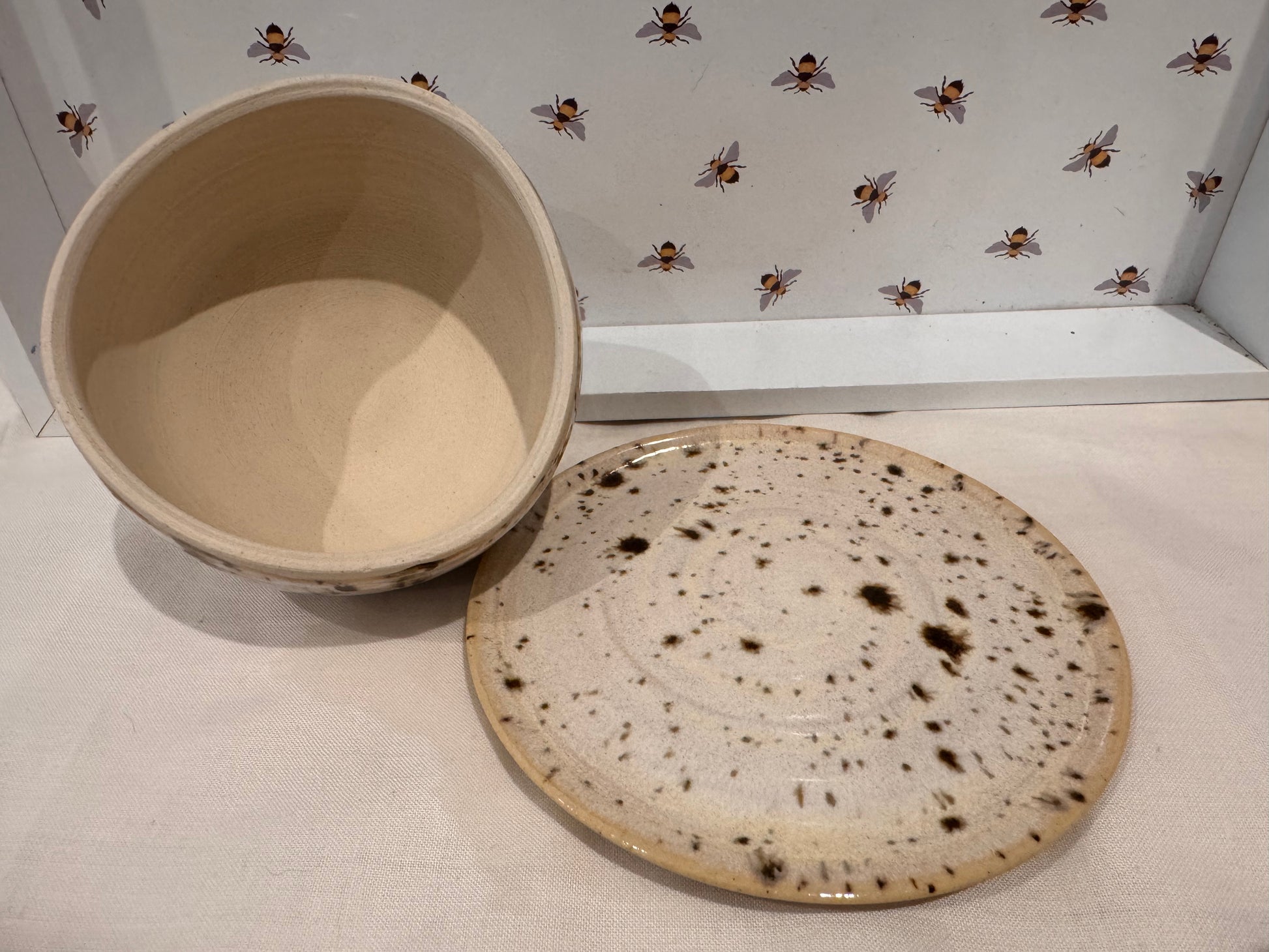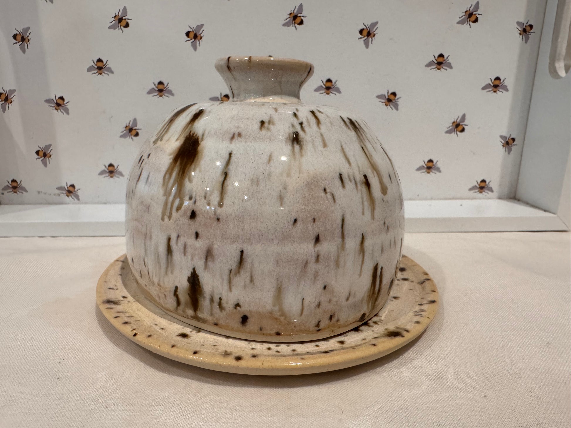 This unique butter dish is made from white stoneware clay. Hand thrown on the wheel and glazed by hand.