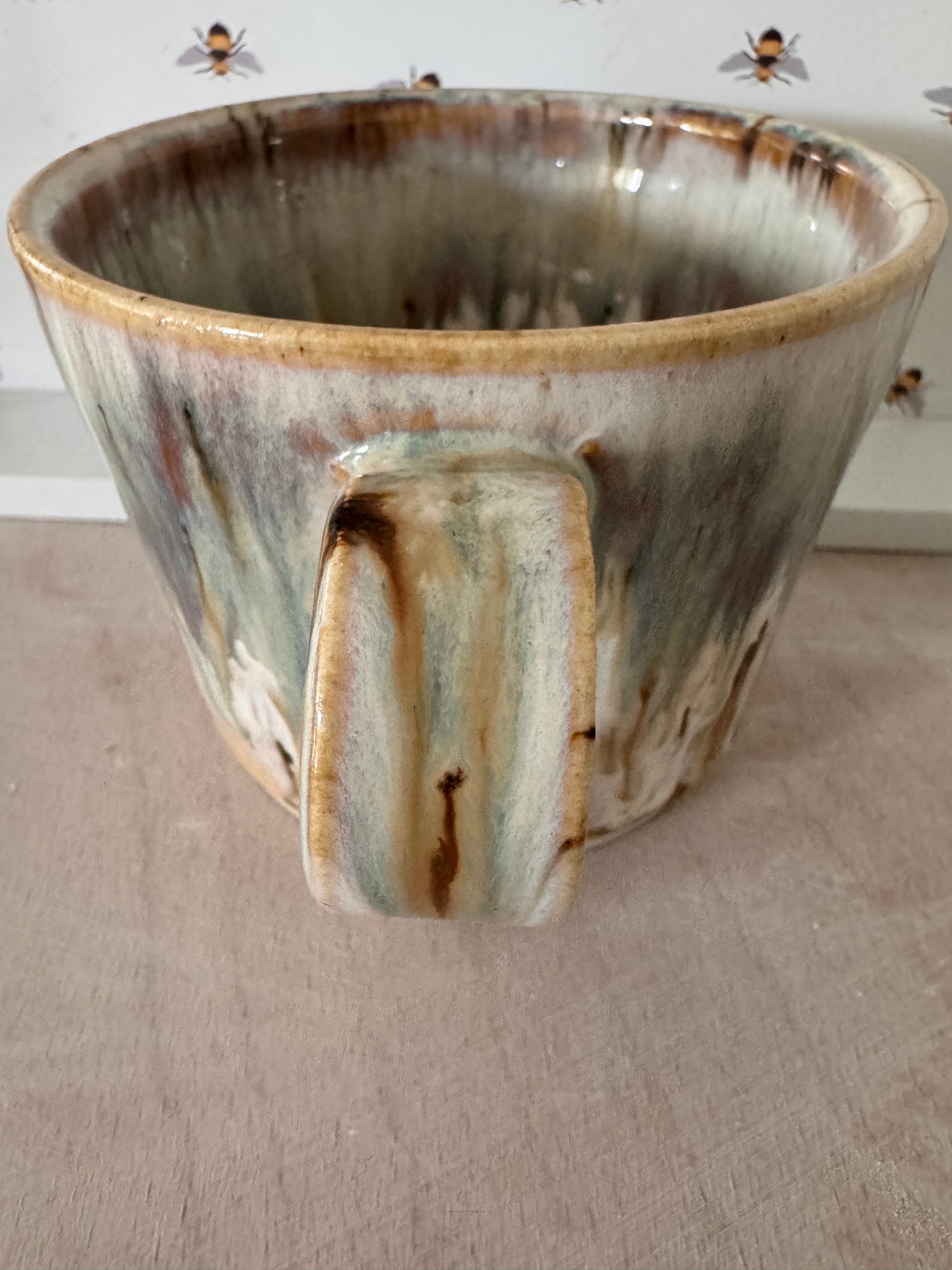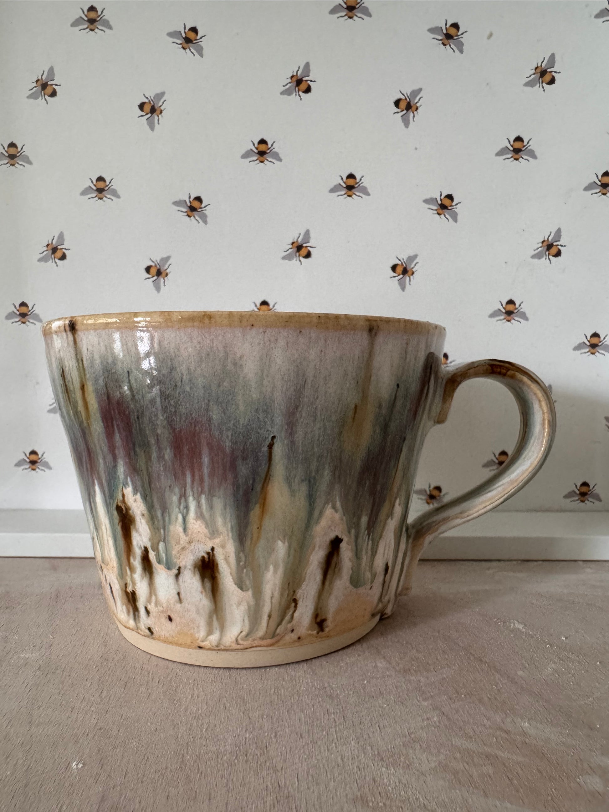 This mug is made with white stoneware clay. Hand thrown by me on the wheel. The glazes blend to create a cream colour base with brown flecks, and soft blue-purple shades around the rim. The handle is curved.