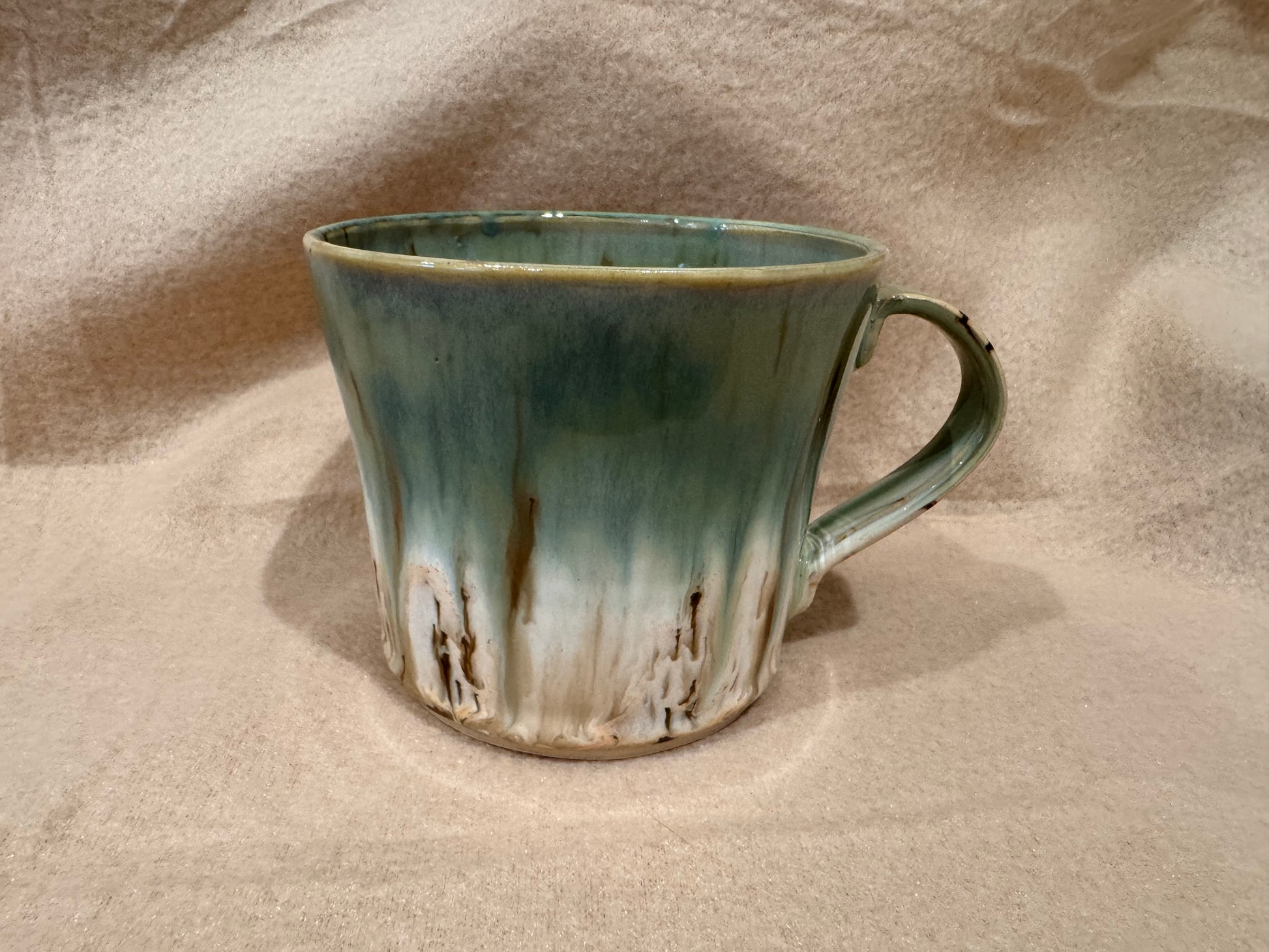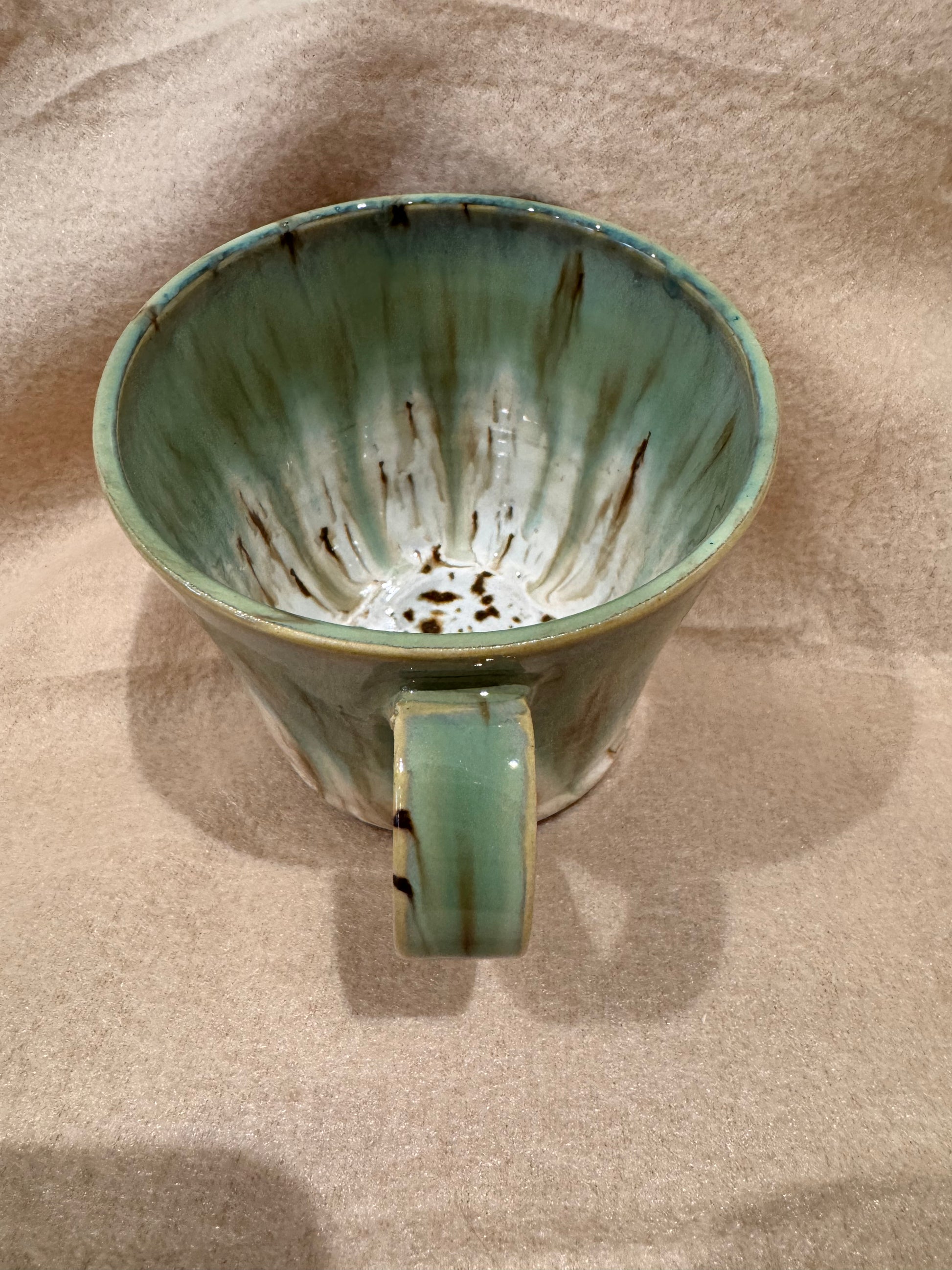 This mug is made with white stoneware clay. Hand thrown by me on the wheel. The glazes blend to create a green glossy finish moving to creams. There are brown flecks created by crystals in the glaze. The handle is curved.