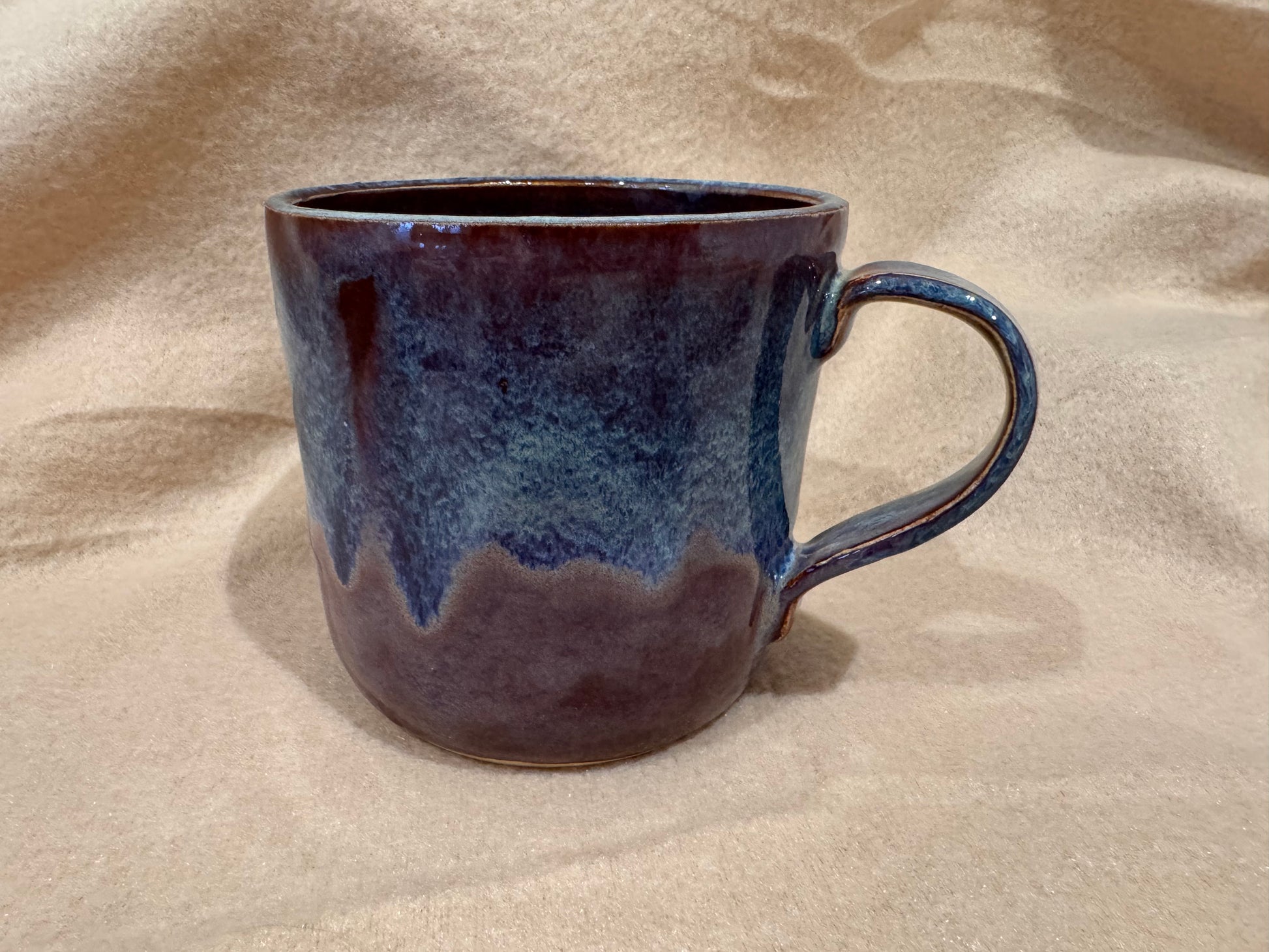 Purple-blue glazed blend on this mug, over the white stoneware clay. White inside the mug. Hand thrown by me on the wheel.