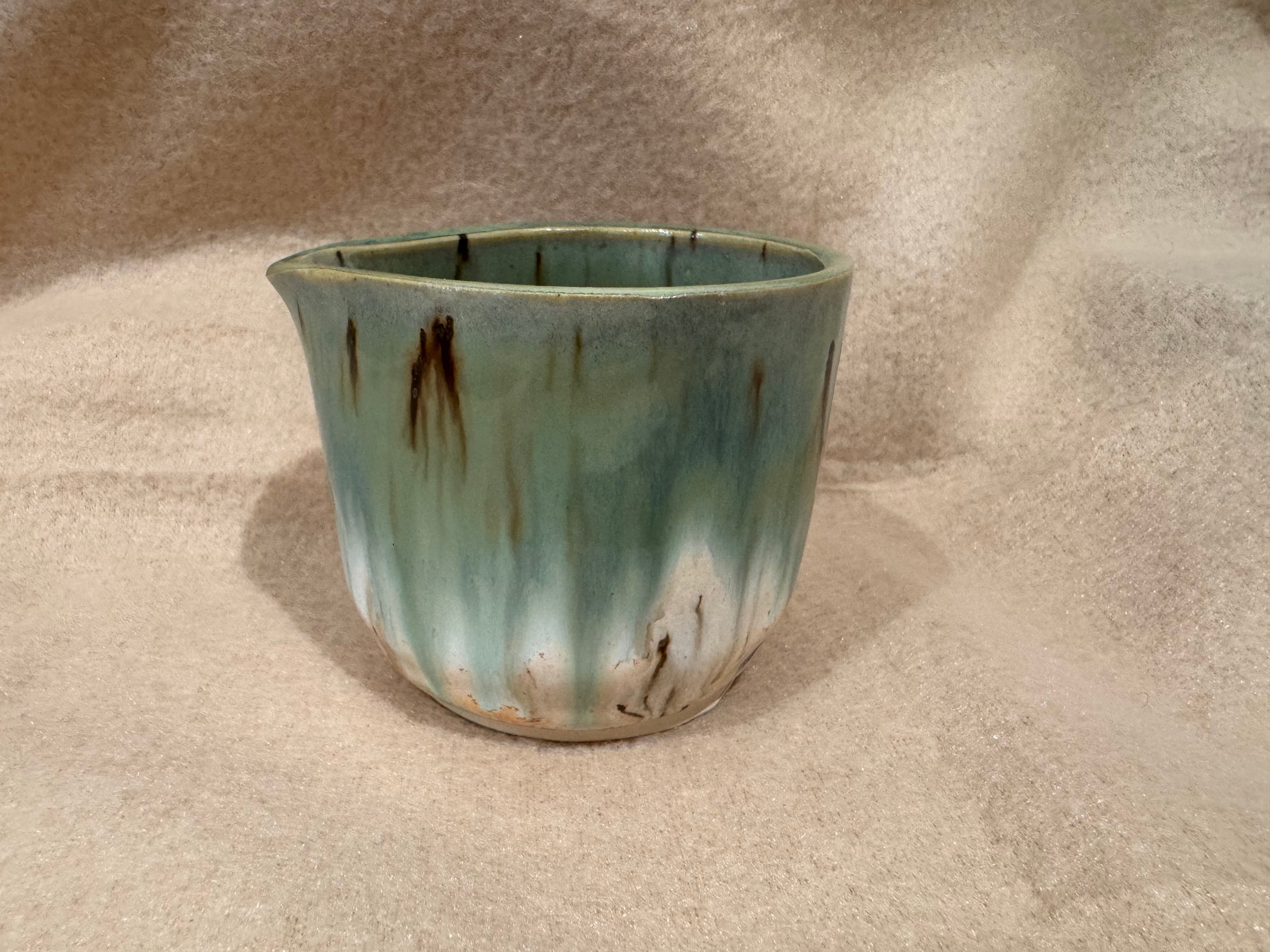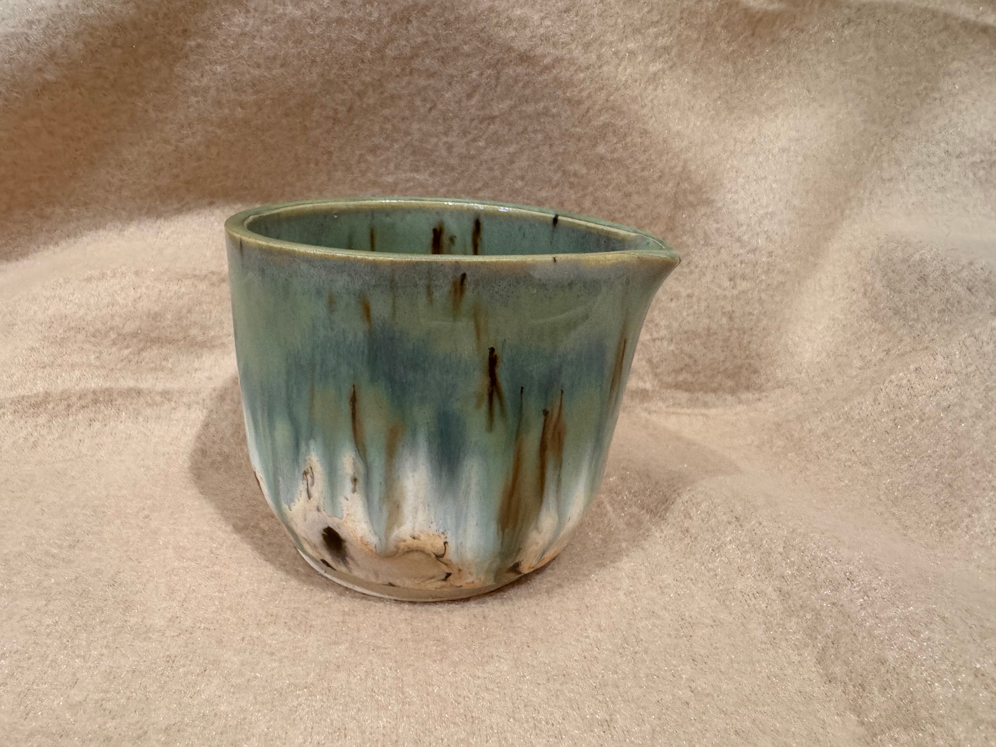 Hand thrown and glazed by hand, this pourer is a lovely mossy green blending into cream. There are flecks of brown from crystals in the glaze.