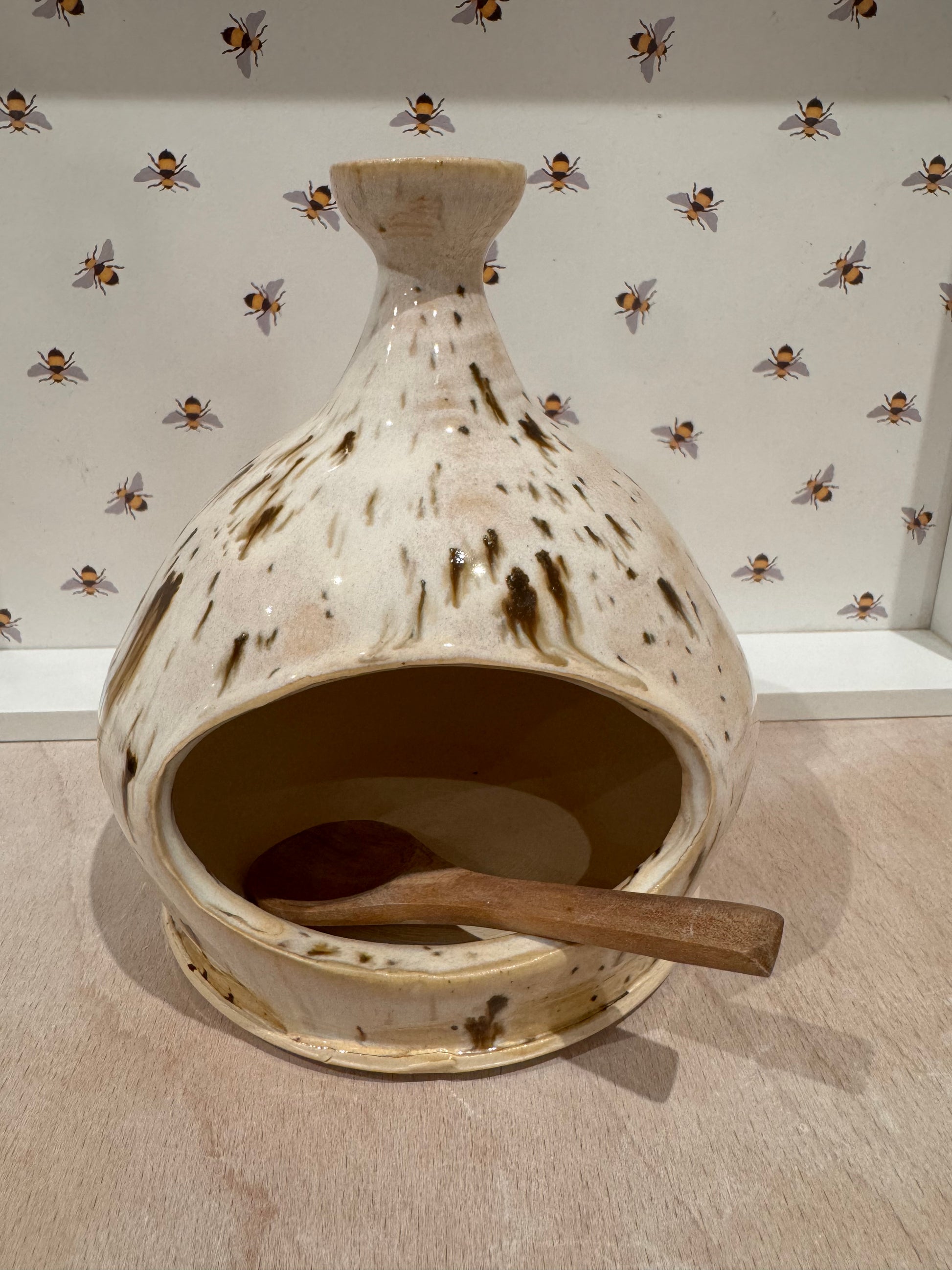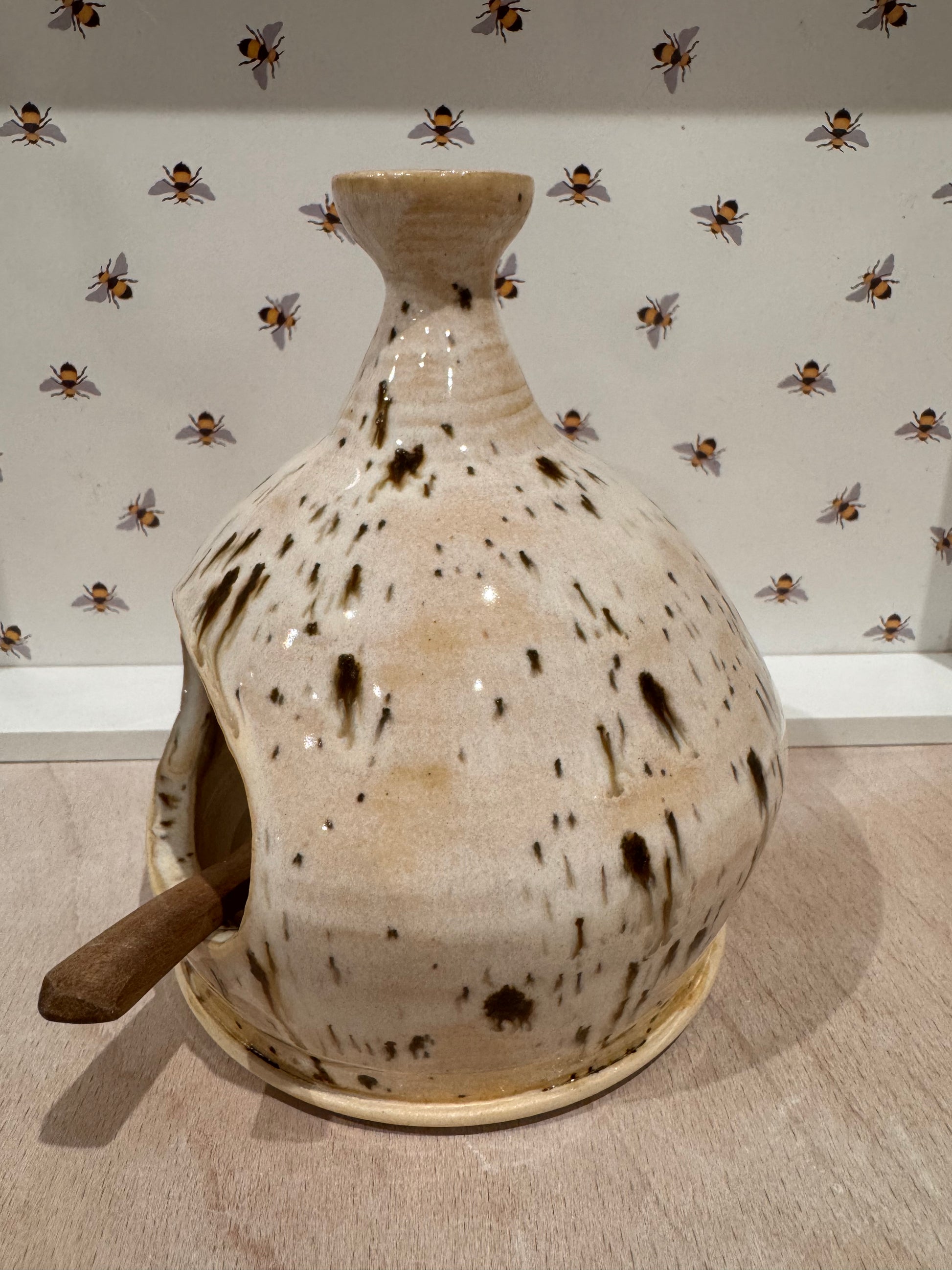 Salt pig, thrown by hand on the wheel and glazed with a cream shade. Flecks of brown crystals break to give a lovely effect.