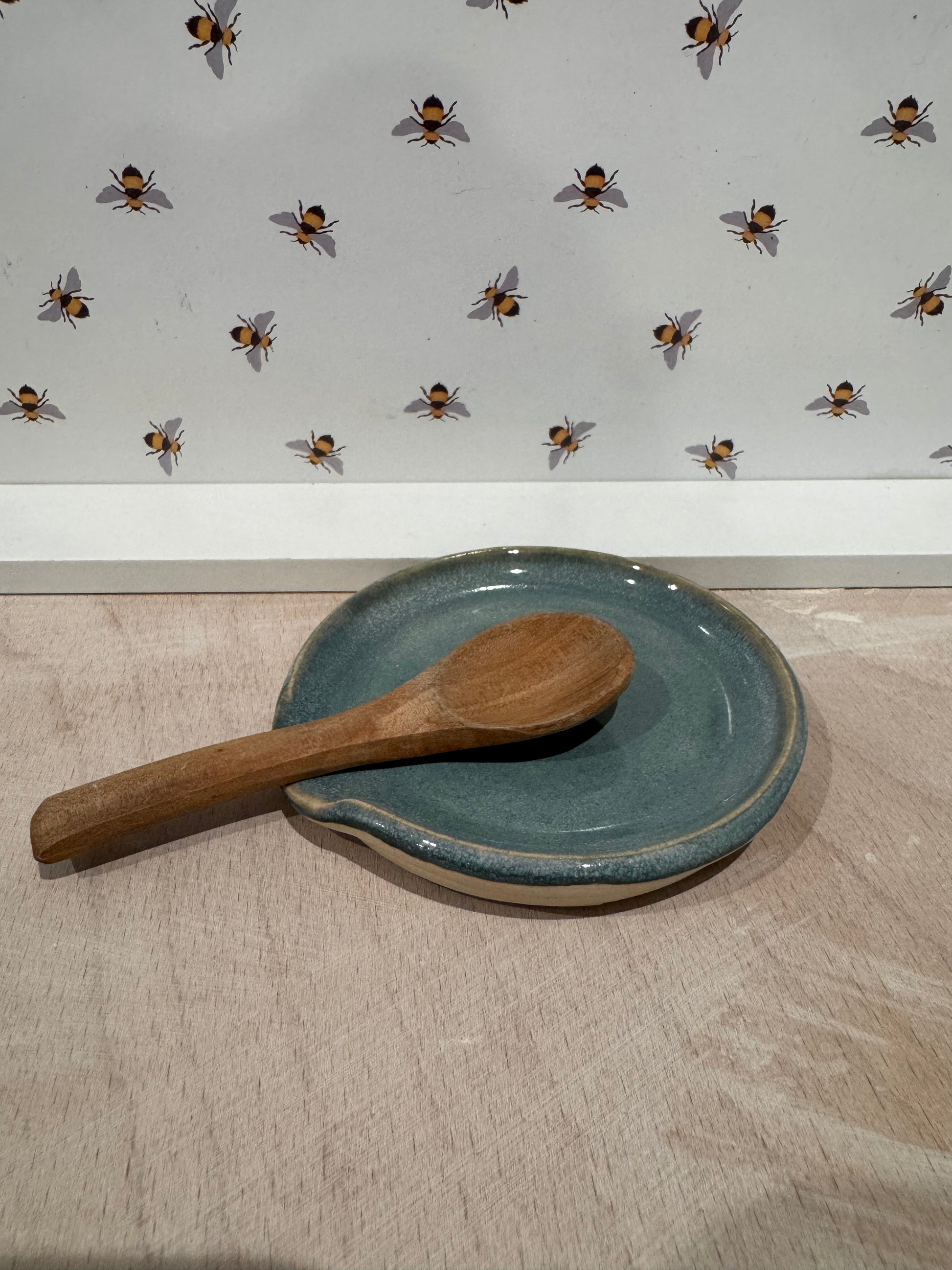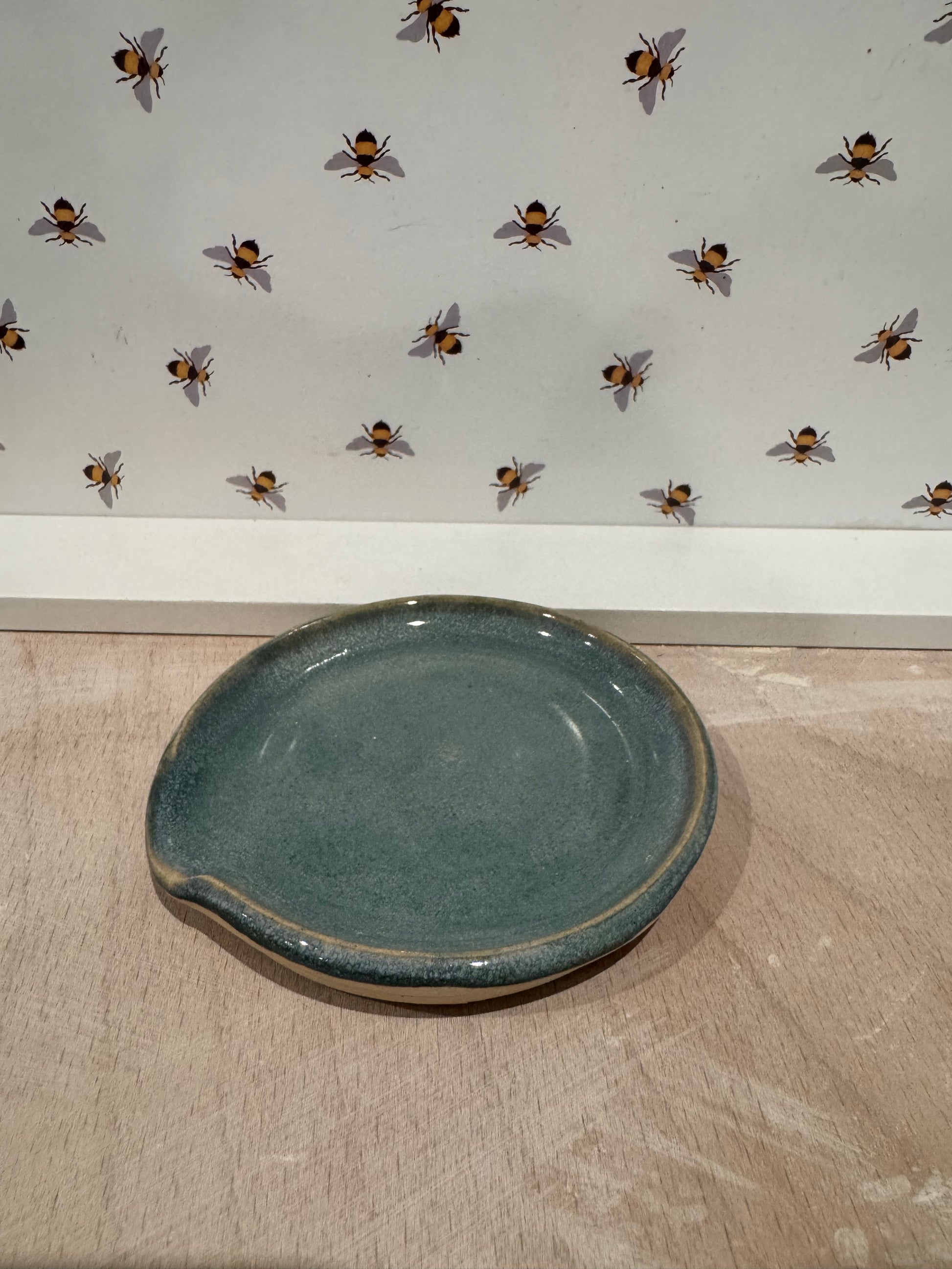 Spoon rest to keep your work surface clean and clear. A soft turquoise glaze on a white stoneware clay.